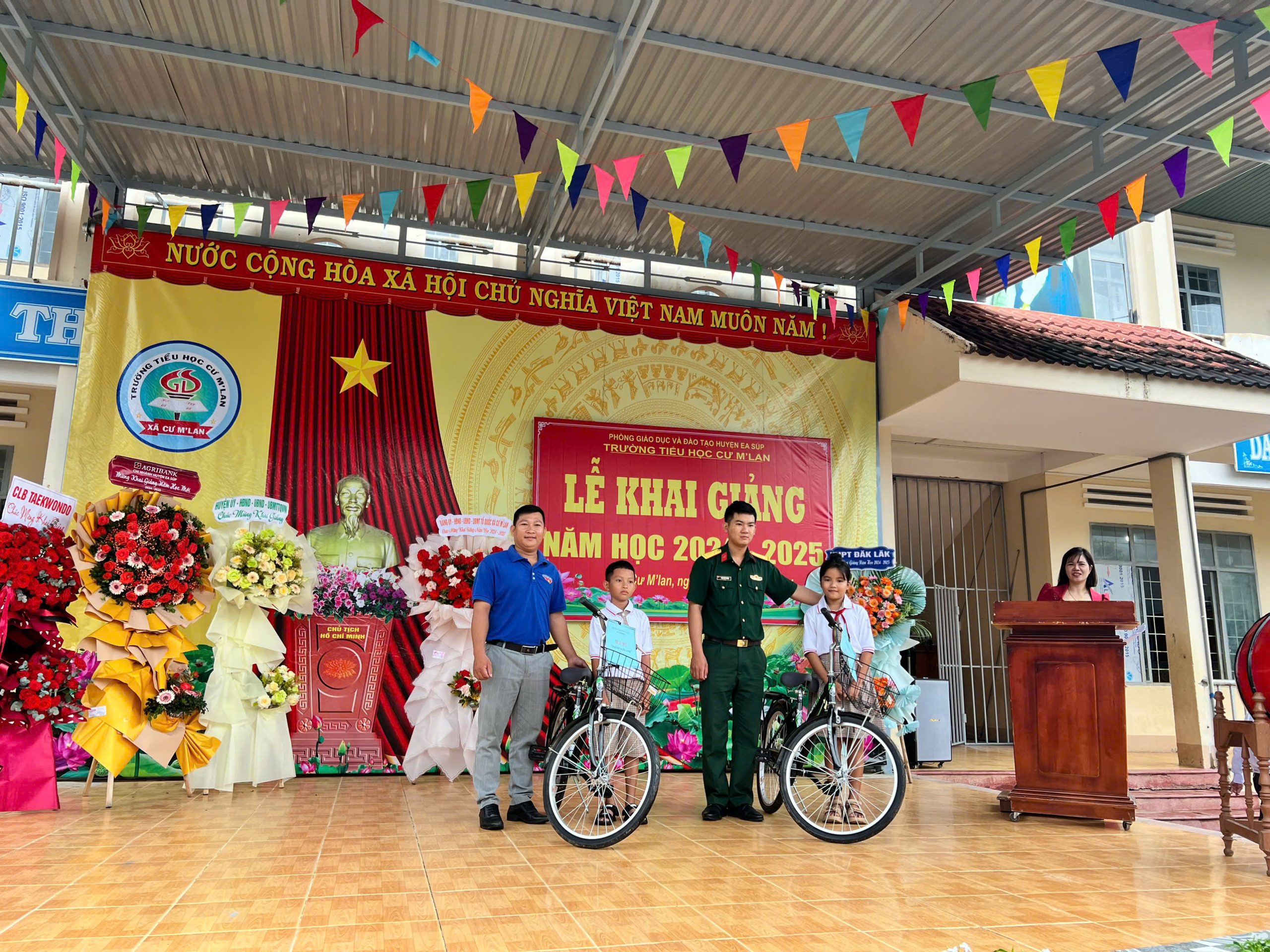Cũng nhân dịp lễ khai giảng năm học mới nhà trường được Anh Trần Kim Chất – Bí thư đoàn xã đã kết nối Đại đội bộ binh 2 tặng 2 chiếc xe đạp và 5 phần quà cho học sinh nghèo vượt khó.